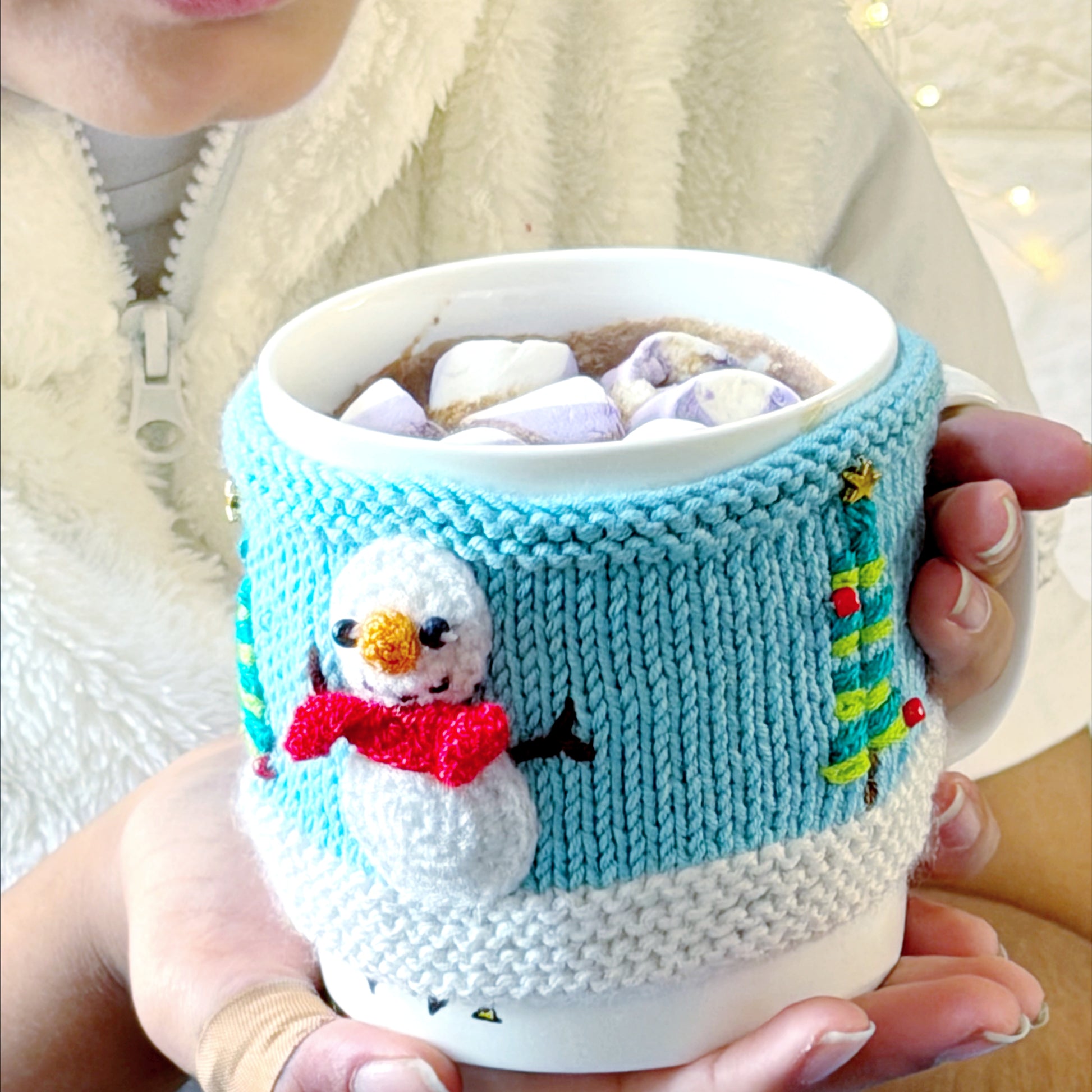 - Hand-knitted mug warmer with 3D snowman